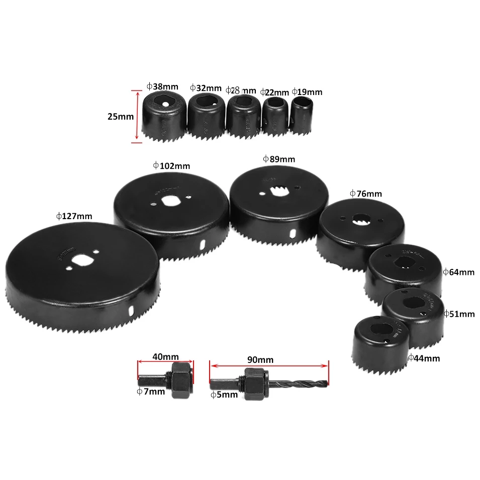 1 x Hole Saw Set (8 Pcs = 5 carbon steel hole saws + 1 connecting rod + 1 hex wrench key + 1 reinforcing plate)